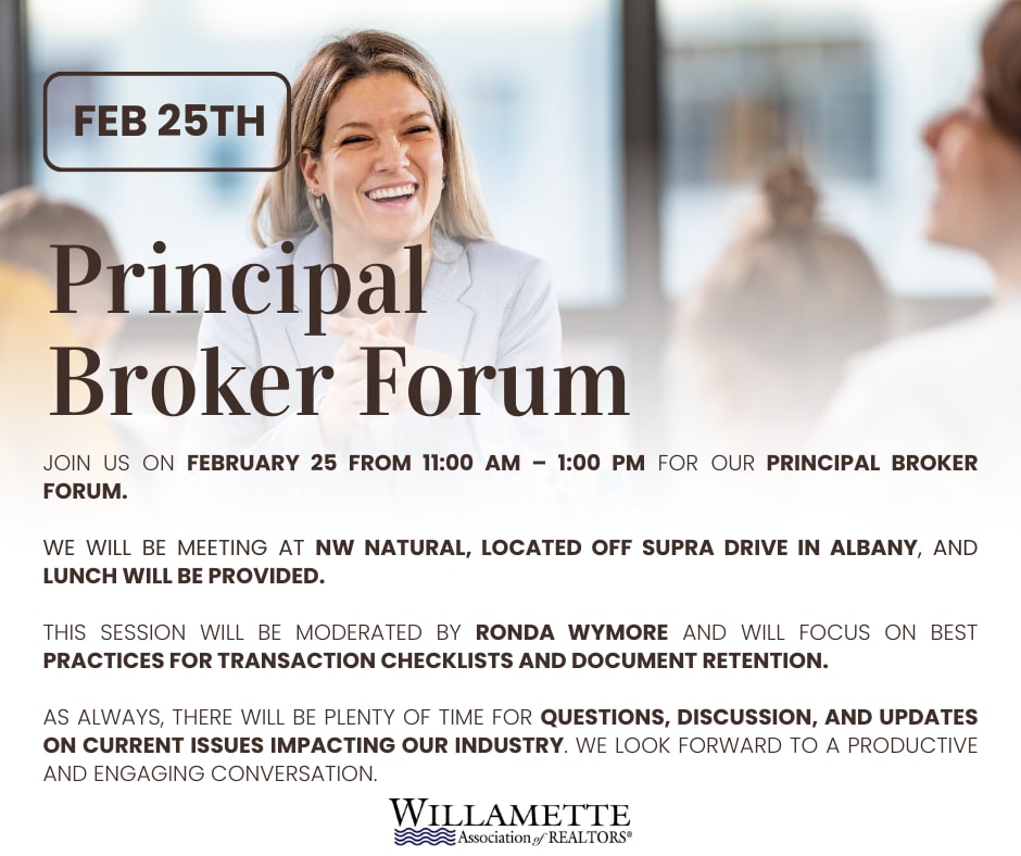Our Principal Broker Forum is happening February 25 from 11:00 AM–1:00 PM at NW Natural in Albany. Moderated by Ronda Wymore, this forum will cover transaction checklists, document retention, and current industry topics, plus plenty of time for Q&A.